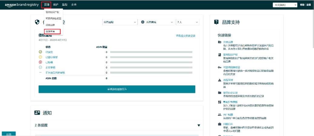 您可以登录亚马逊品牌注册后台,在“管理 > 品牌申请”中查看。