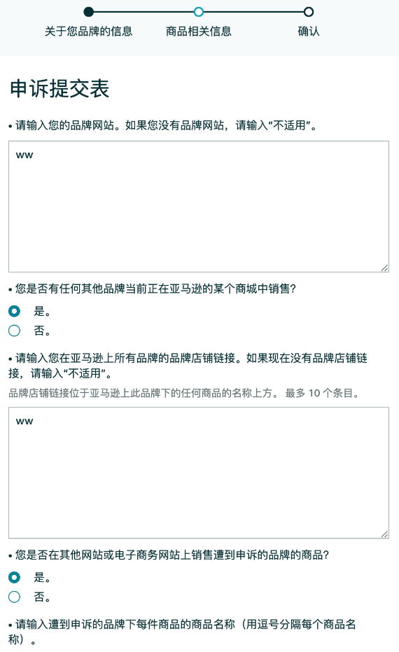 点击您的申诉链接,登录亚马逊品牌注册门户网站,进入申诉页面,填写您的品牌信息。