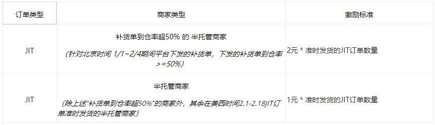 为鼓励商家在春节期间JIT订单准时发货,平台将对支付时间在2024年2月1日至2024年2月18日(美西时间)期间的订单推出商家JIT发货奖励机制。商家在该时段期间准时发货的JIT订单,平台会给予这部分订单每单1-2元人民币(CNH)的奖励。请你详细阅读以下规则,以便顺利满足要求,获得平台奖励。以下规则将详细介绍对应名词说明,活动周期,奖励方案等内容。