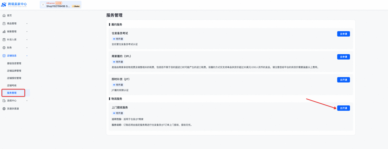 在全托管店铺中开通“上门揽收服务”:通过左侧“店铺信息”-“服务管理”菜单找到“上门揽收服务”,点击【去开通】